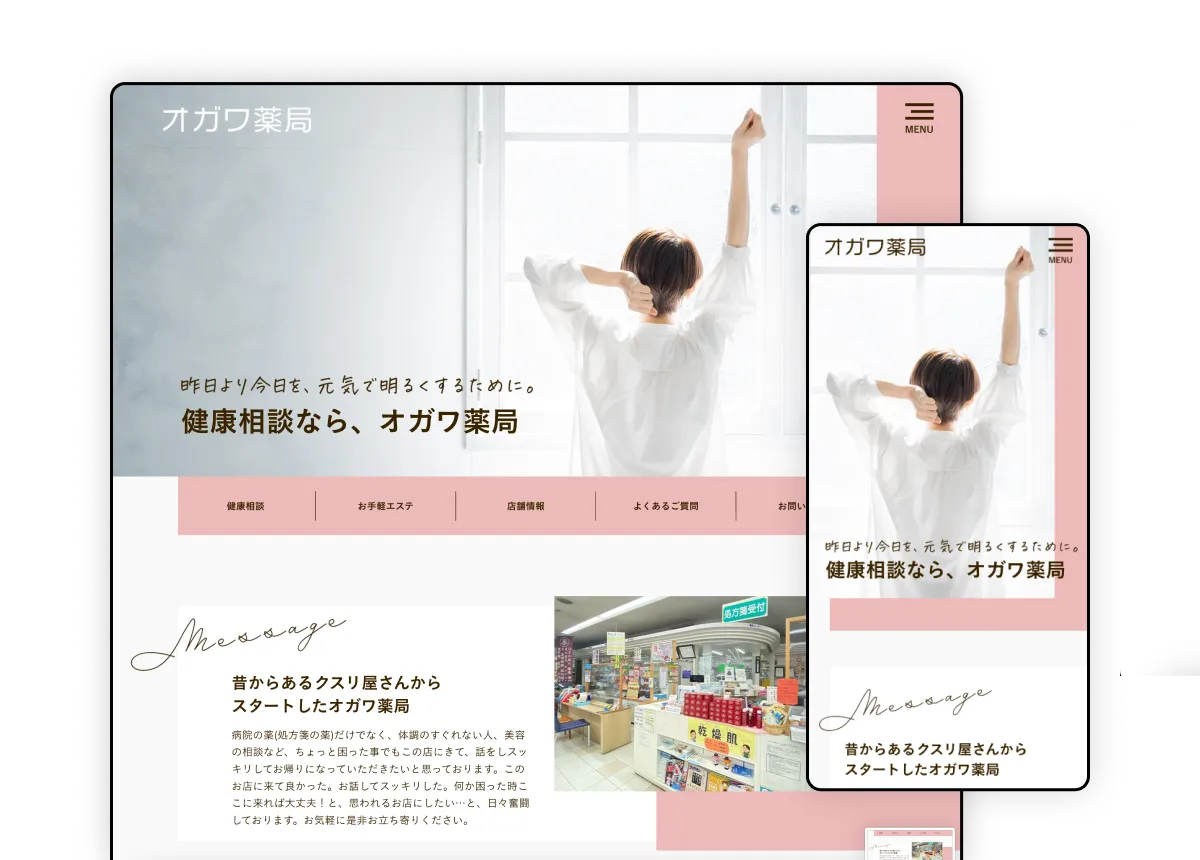 静岡県御前崎市で調剤薬局とエステサロンを営むオガワ薬局様のホームページを制作。女性に安心感を与える優しいデザインと情報発信力を強化する構成で、新規集客とリピーター増加をサポートしました。