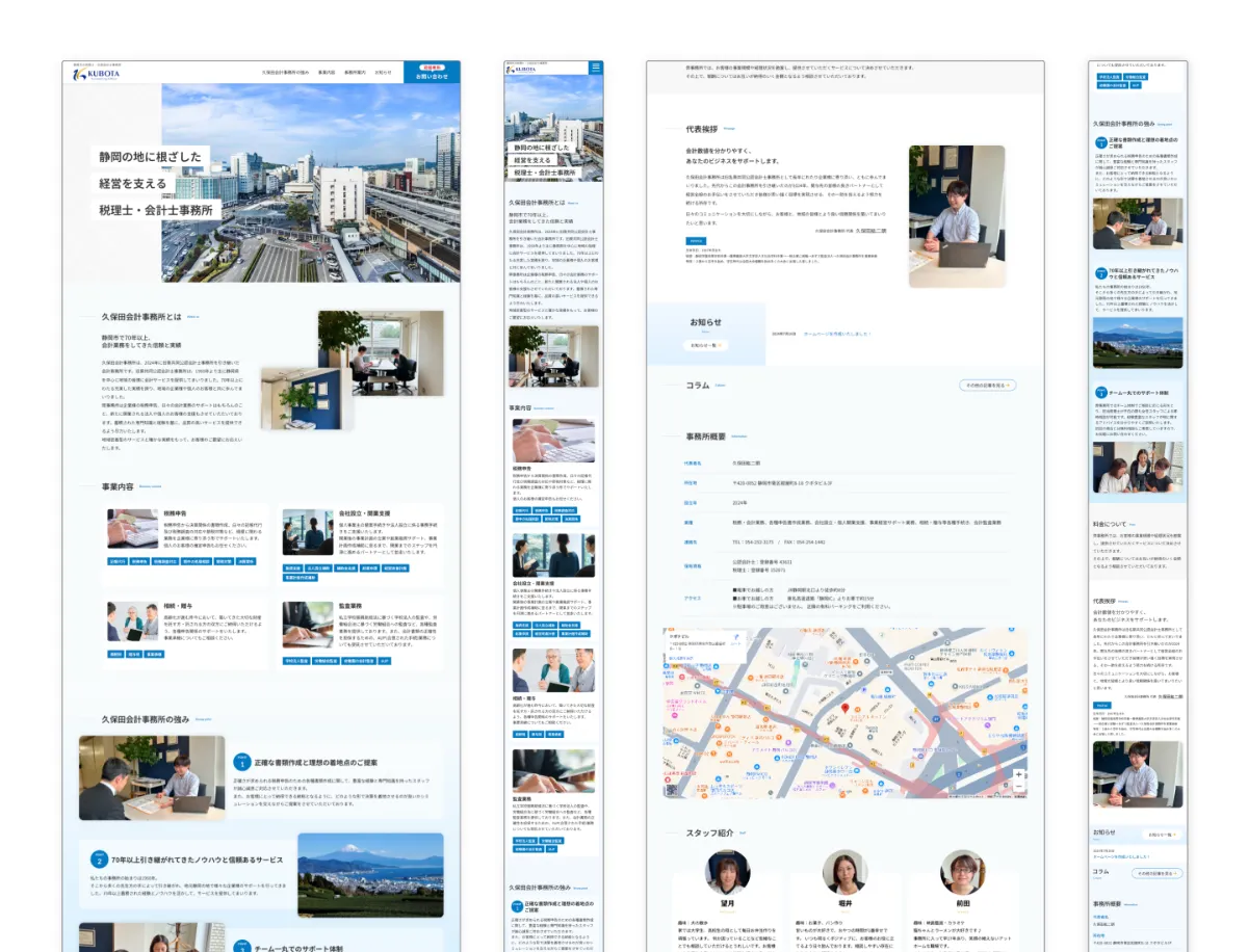 これまでホームページを持たなかった久保田会計事務所様が、オンラインでの存在感を強化し、特に『静岡市 税理士』というキーワードでSEO上位を目指すためのホームページ制作を依頼されました。業務内容や強みを端的に明確に伝え、まずは相談に繋げる導線を整えることが重要でした。