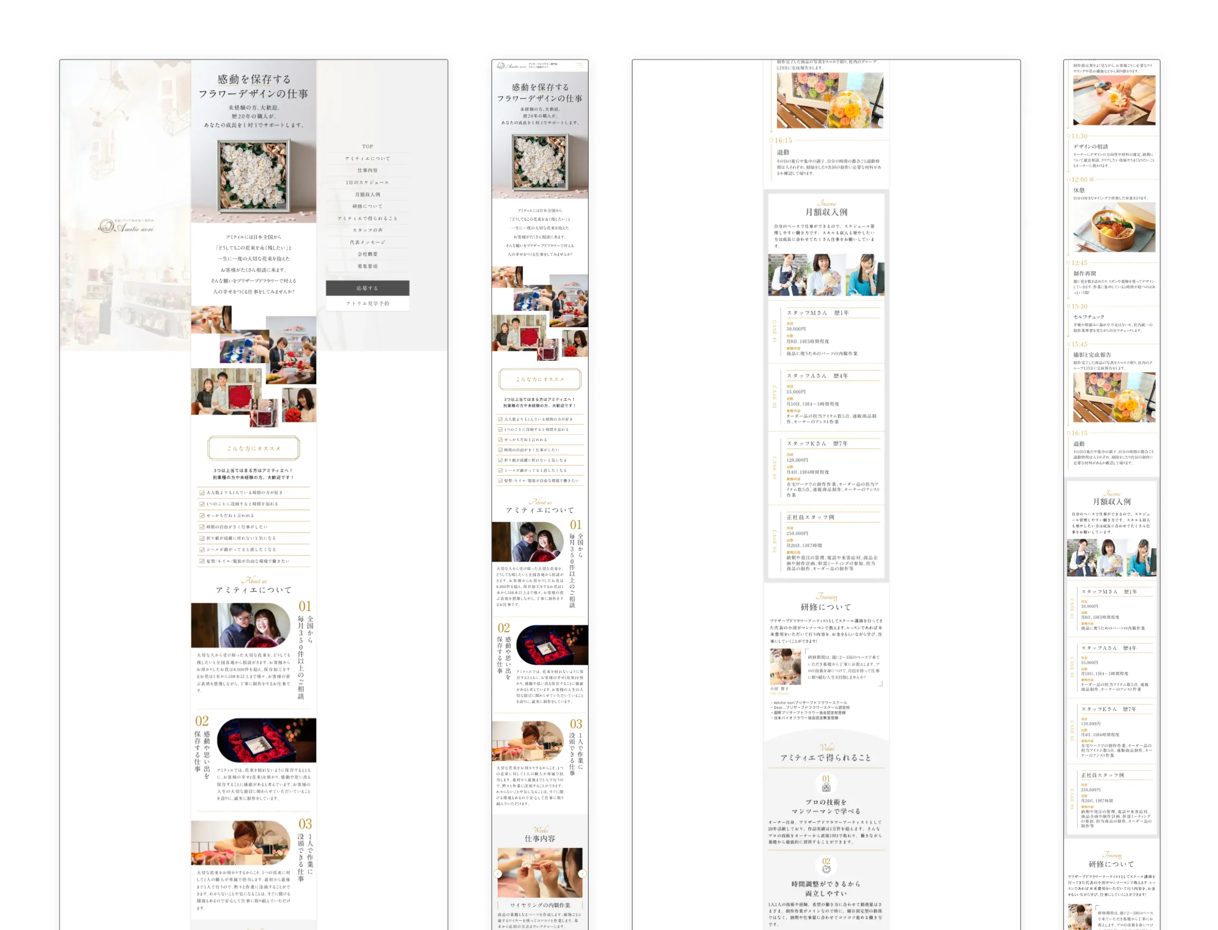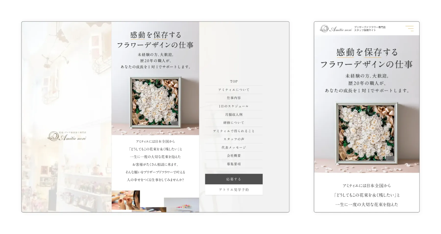 プリザーブドフラワーの繊細さや美しさを引き立てるデザインを重視しました。保存加工の特性を考慮し、高級感がありながらも親しみやすい配色やフォントを採用。また、若い世代の求職者が主にスマートフォンから閲覧することを想定し、スマホファーストで設計されたデザインを実現しました。