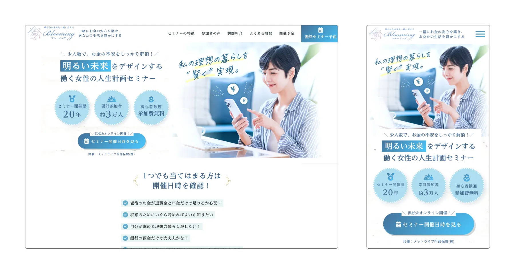 ブルーミング株式会社様は、資産運用や保険見直し、家計管理など多岐にわたる相談を受け付けてきた実績があります。しかし、セミナー情報が既存のホームページ内に埋もれてしまい、開催日程や内容を分かりやすく伝えられる導線が不足していました。