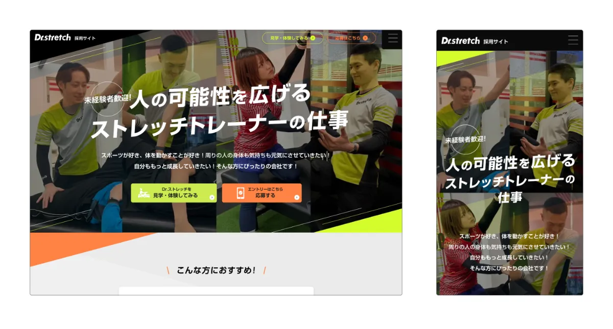 Dr.stretch様は、一般の方からプロのスポーツ選手まで、幅広い層に向けてストレッチ専門のトレーニングサービスを展開する企業です。今回、採用強化を目的に、求職者が「自分らしく働ける場所」だと直感的に感じてもらえるような採用サイトを制作しました。