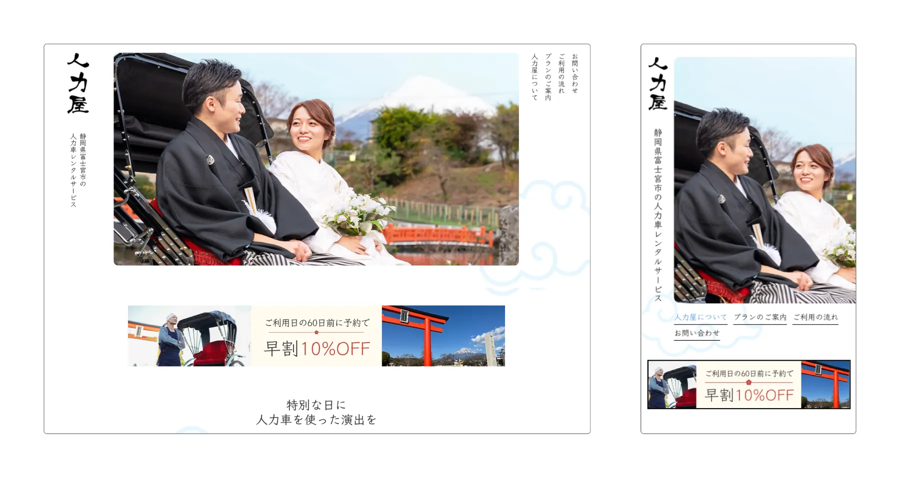 静岡県富士宮市で人力車の事業を行っている株式会社レジメンタル-人力屋様のホームページを制作させていただきました。