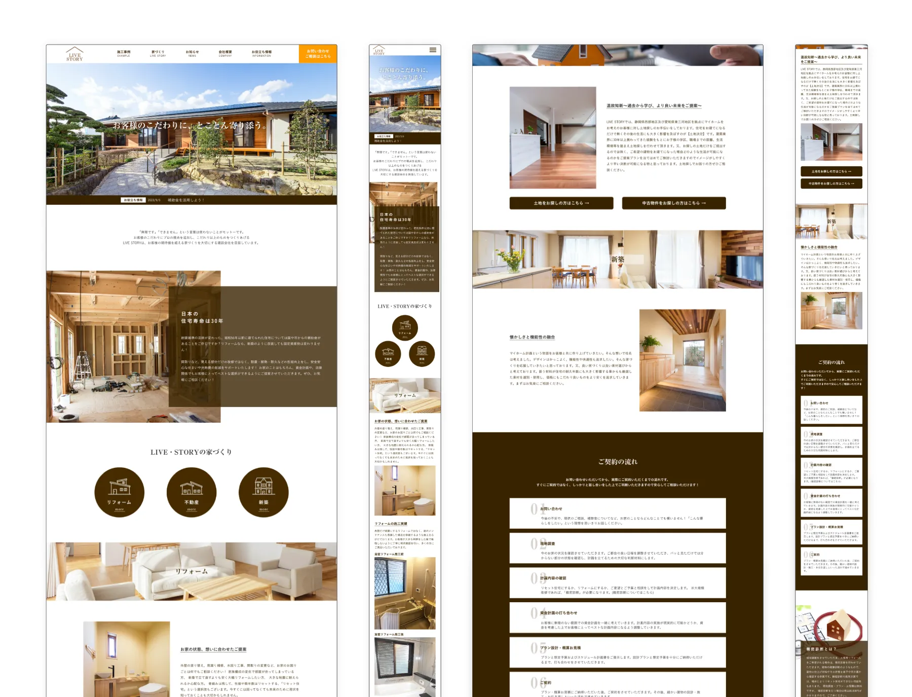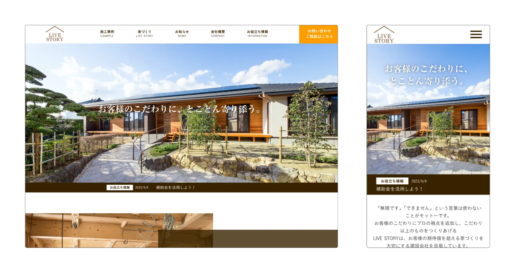 静岡県浜松市北区で新築・リフォーム業を行うLIVE・STORY様のホームページを制作。木の温かみを感じさせる清潔感のあるデザインで、親切・丁寧な提案の強みを伝え、認知拡大と集客UPを目指した構成を実現しました。