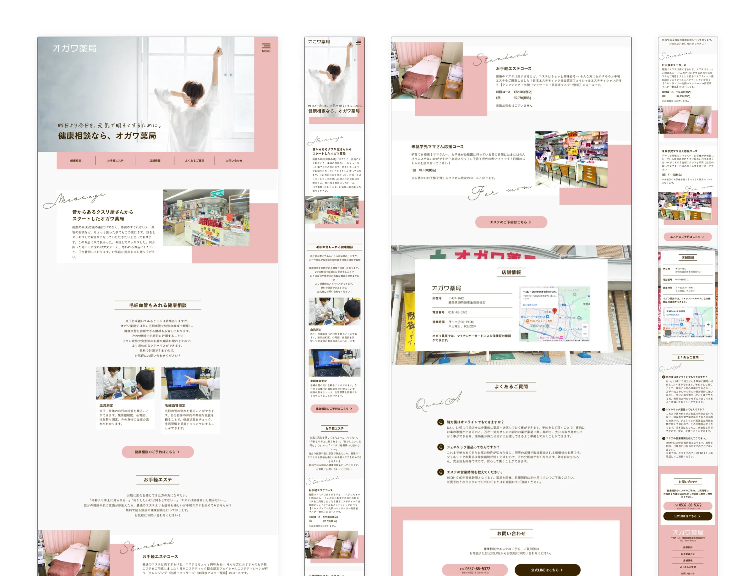 静岡県御前崎市で調剤薬局とエステサロンを営むオガワ薬局様のホームページを制作。女性に安心感を与える優しいデザインと情報発信力を強化する構成で、新規集客とリピーター増加をサポートしました。