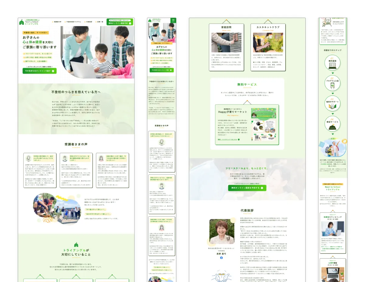 親子で不登校の改善に取り組むという、全国的にも珍しい支援スタイルを展開されているトライアングル様。これまで口コミや対面での信頼構築を中心に活動されていましたが、その“温かさ”や“支援への本気度”が、Webでは十分に伝えきれていないという課題がありました。また、支援内容が多岐にわたるため、全体像が見えにくく、初めての方には一歩踏み出しづらい印象を与えていました。そこで今回の制作では、想いと専門性を言語化し、サービス内容を体系的に整理することで、「ここなら任せられる」と感じていただけるような信頼感のある設計を目指しました。