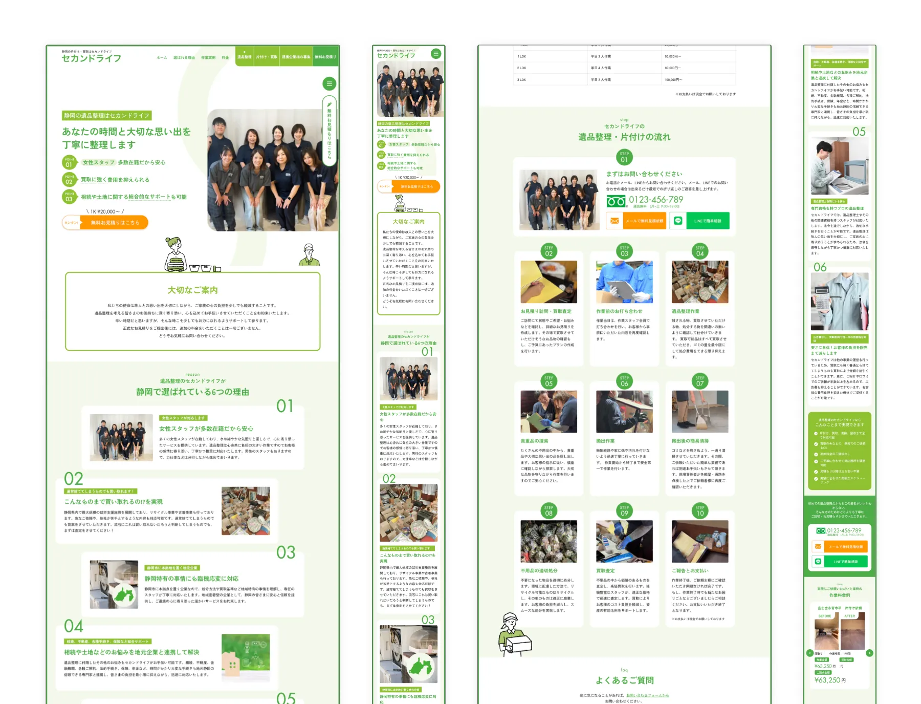 • サービスの透明性を重視: 遺品整理という特性上、訪問者が安心して依頼できるよう、サービス内容を具体的かつ詳細に掲載しました。また、これまでの実績や具体的な事例を豊富に紹介することで、信頼感を高めました。